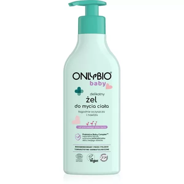 ONLYBIO Baby Delikatny żel do mycia ciała dla niemowląt od 1 dnia życia to łagodny preparat przeznaczony do codziennej pielęgnacji wrażliwej skóry niemowląt. Regularne stosowanie utrzymuje skórę w doskonałej kondycji, nawilżając ją i chroniąc przed przesuszeniem.