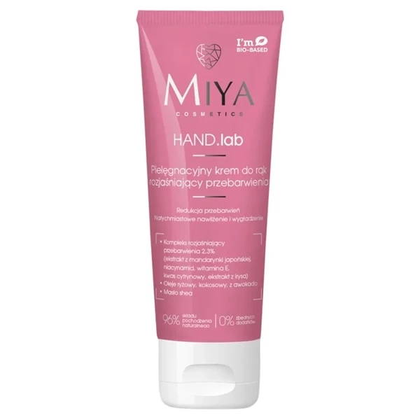 Redukcja przebarwień na dłoniach. Natychmiastowe nawilżenie i wygładzenie. Nawilżająca, kremowa formuła wzbogacona o kompleks rozjaśniający przebarwienia (ekstrakt z mandarynki japońskiej, niacynamid, witamina E, kwas cytrynowy, ekstrakt z irysa), olej ryżowy, kokosowy, z awokado i masło shea.