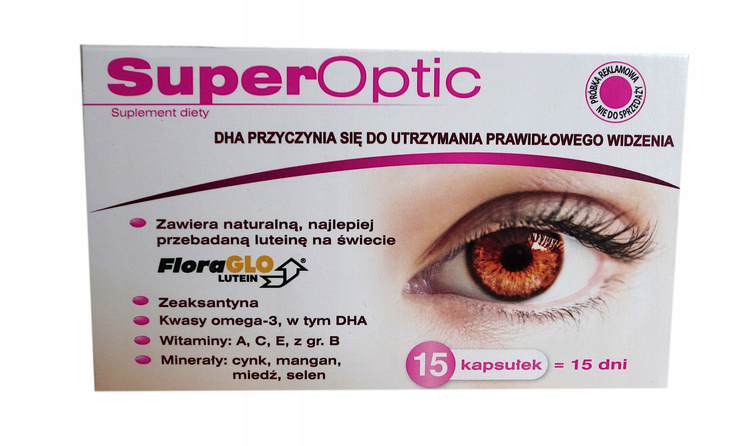 SuperOptic DHA to specjalistyczny suplement diety opracowany z myślą o wsparciu prawidłowego widzenia i ochronie oczu przed negatywnym wpływem czynników zewnętrznych, takich jak promieniowanie UV, praca przy komputerze czy starzenie się organizmu. Dzięki starannie dobranej formule, zawierającej składniki aktywne takie jak luteina, zeaksantyna, kwasy omega-3 oraz witaminy i minerały, wspomaga zdrowie oczu, poprawiając jakość widzenia i chroniąc narząd wzroku przed stresem oksydacyjnym.