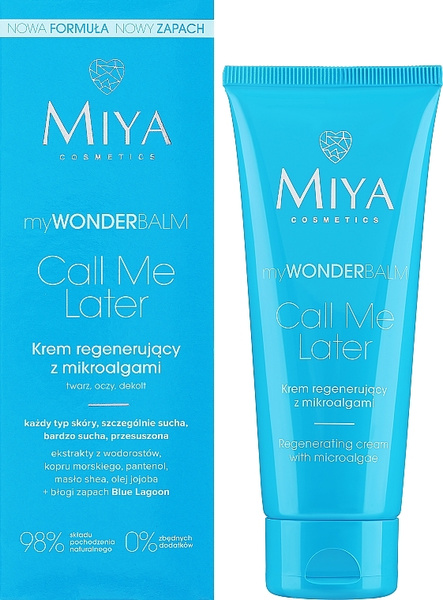 MIYA myWONDERBALM Call Me Later regenerujący krem z mikroalgami który został stworzony z myślą o każdym typie skóry, w tym wrażliwej. Ten wyjątkowy krem, szczególnie zalecany dla skóry suchej i bardzo suchej, jest idealnym rozwiązaniem do pielęgnacji twarzy, szyi, dekoltu, okolic oczu, dłoni oraz całego ciała. Posiada wszechstronne zastosowanie – sprawdzi się zarówno jako preparat na dzień, jak i na noc. Dzięki unikalnej formule sprzyja regeneracji, odżywia i skutecznie niweluje suchość oraz szorstkość. Ekstrakty z mikroalg, wodorostów, kopru morskiego oraz planktonu dbają o optymalny poziom nawilżenia skóry, jednocześnie zwiększając jej sprężystość i jędrność. Przyjemny zapach Blue Lagoon przywołuje letnie wspomnienia, wprowadzając w stan odprężenia i relaksu. Dzięki lekkiej, kremowej konsystencji preparat szybko się wchłania, co czyni go doskonałą bazą pod makijaż, nie zapychając porów.