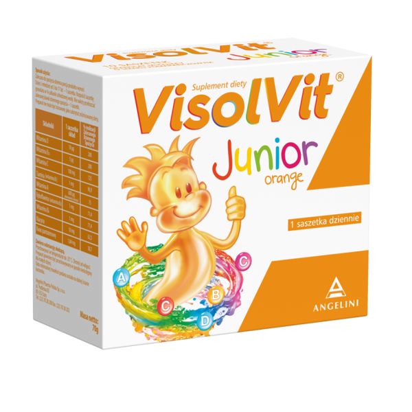 Suplement dla dzieci Visolvit Junior Orange to zestaw witamin w saszetkach musujących. Witaminy zawarte w suplemencie wspomagają prawidłowe funkcjonowanie układu odpornościowego, zwiększają przyswajanie żelaza, a także wspierają prawidłową produkcję kolagenu w celu zapewnienia prawidłowego funkcjonowania chrząstki, dziąseł i zębów. Suplement pomaga w prawidłowym wchłanianiu wapnia i fosforu, a także pomaga w utrzymaniu zdrowych kości, pomaga w utrzymaniu prawidłowego widzenia, zmniejsza uczucie zmęczenia i znużenia.