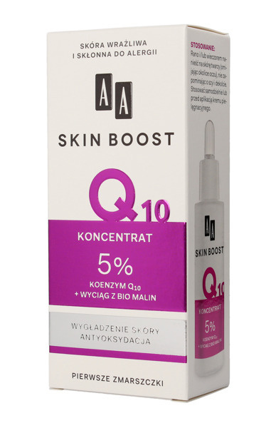 AA Skin Boost Koncentrat z koenzymem Q10 i wyciągiem z BIO malin stanowi aktywną kurację opóźniającą starzenie i wygładzającą, wzmacniającą działanie kremów do codziennej pielęgnacji skóry.