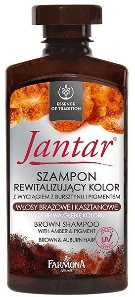 Farmona JANTAR szampon rewitalizujący kolor, przeznaczony do codziennej pielęgnacji włosów brązowych i kasztanowych, działa kompleksowo, skutecznie oczyszczając włosy oraz skórę głowy z zanieczyszczeń, jednocześnie nawilżając i wzmacniając je. Jego unikalne składniki pomagają w utrzymaniu pożądanego odcienia brązowego koloru i zapewniają jedwabistą gładkość.